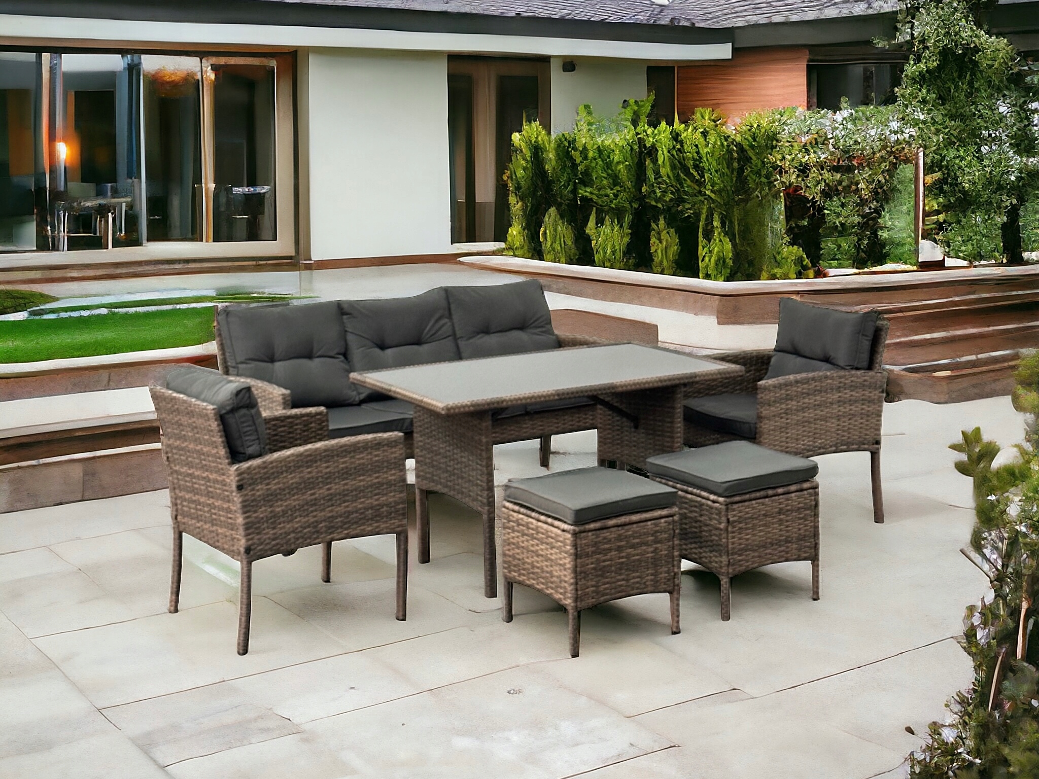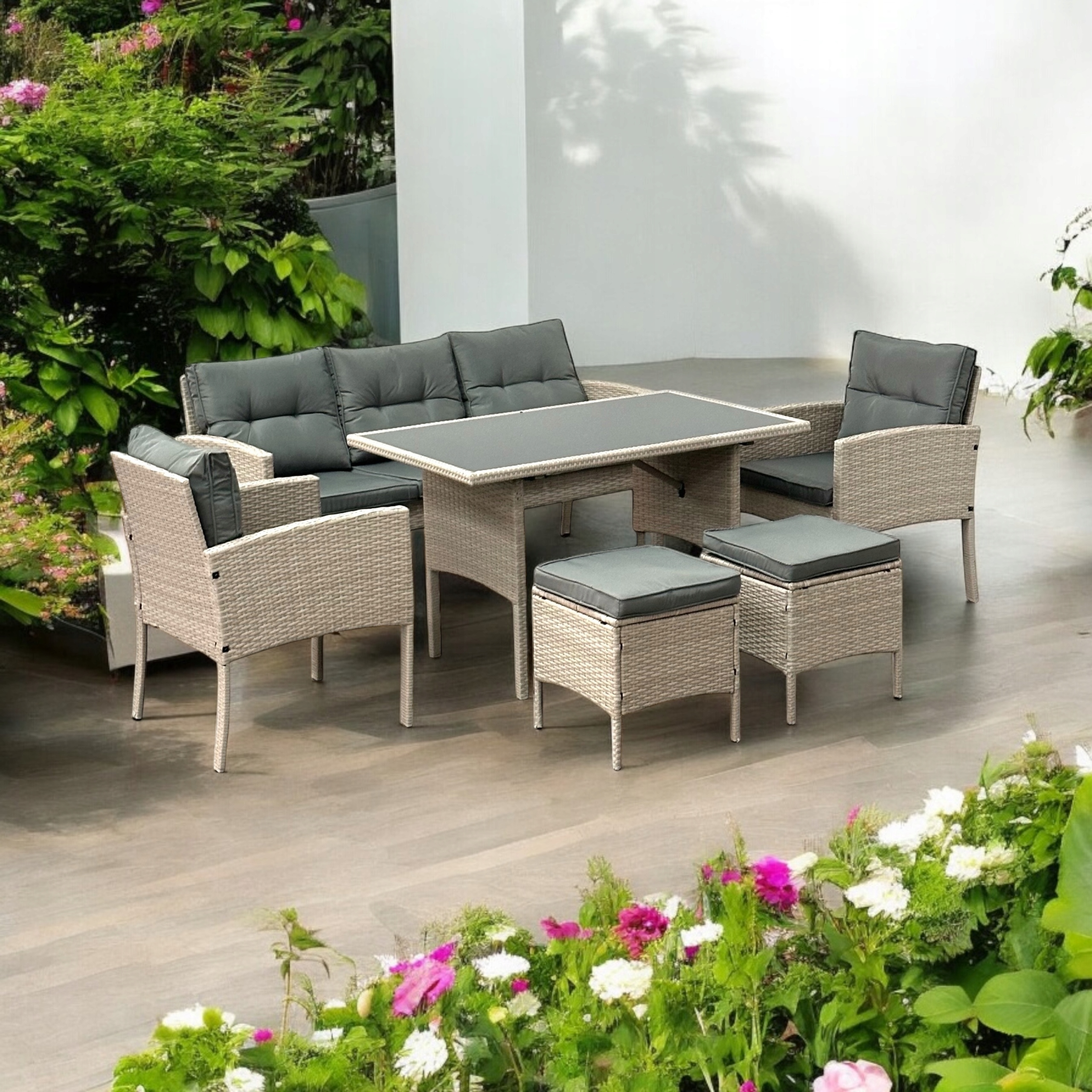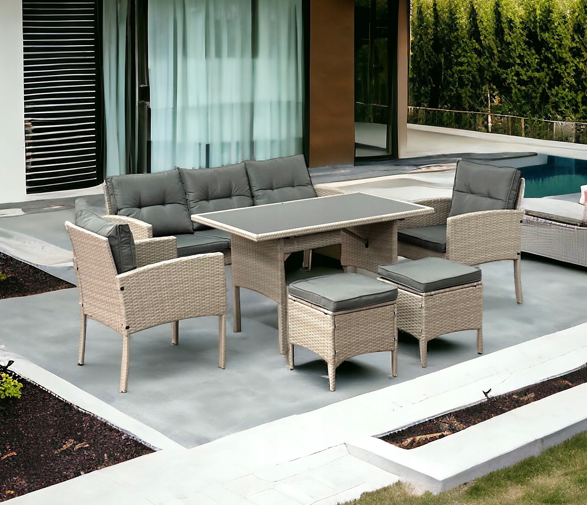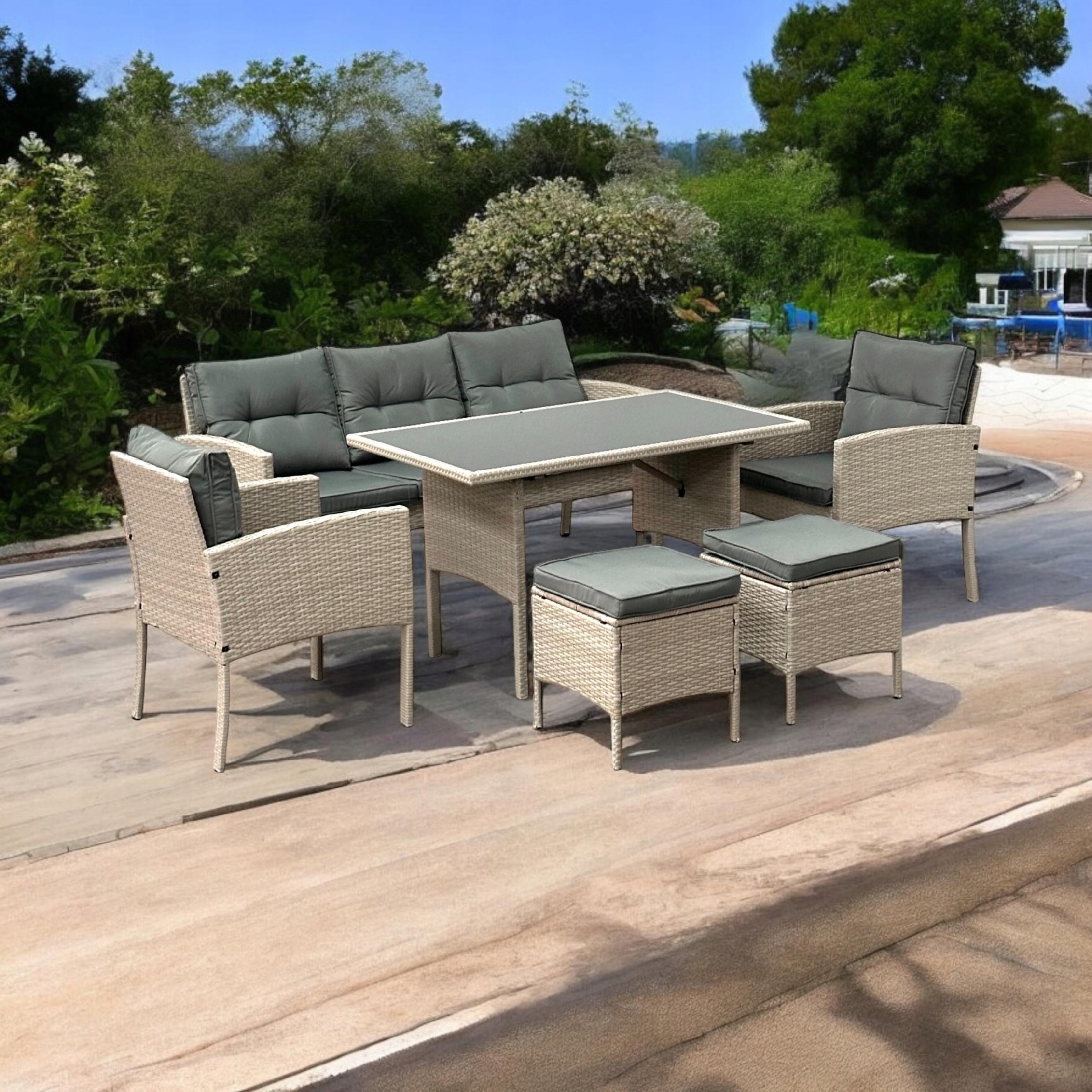 ZESTAW OGRODOWY SFS078 MEBLE OGRODOWE ZESTAW MEBLI OGRODOWYCH W KOLORZE BEŻOWYM Z SZARYMI PODUSZKAMI